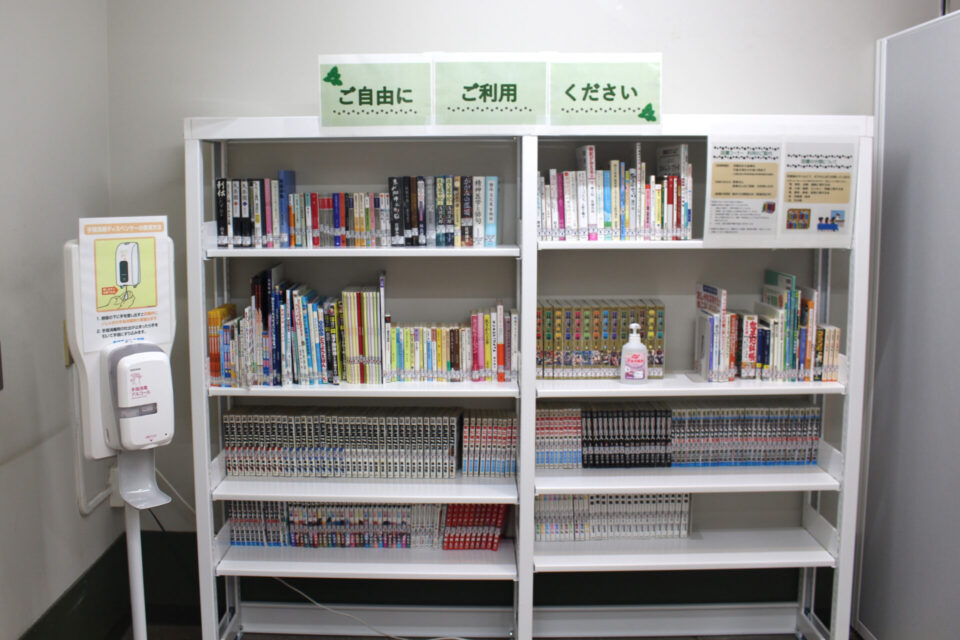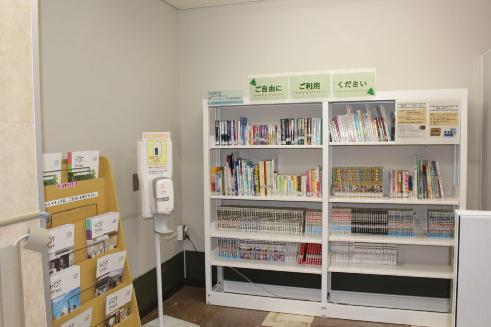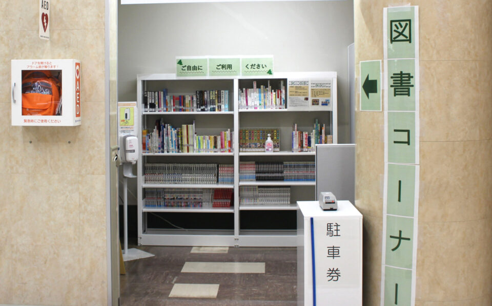 外来1階の駐車券確認コーナーの隣に図書コーナーを開設しました。患者さん、患者さんのご家族の方、付き添いの方はご自由に利用ください。