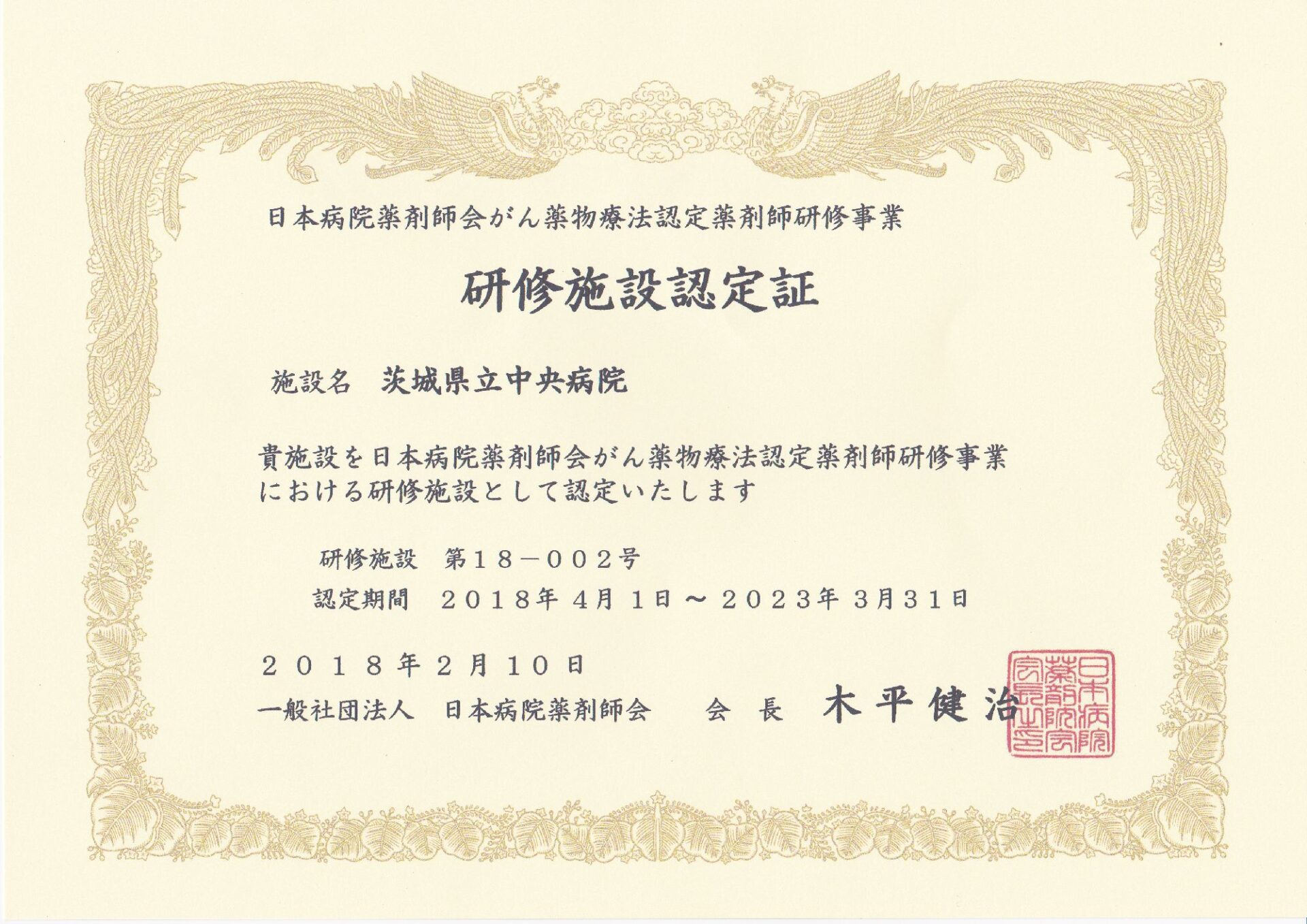 2018.2.10 日本病院薬剤師会がん薬物療法認定薬剤師研修事業研修施設に認定されました。