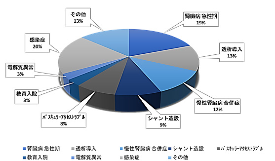 令和6年度の新規入院患者数は319名と一昨年度に比し約2倍に増加しました。県北県南を問わず遠方からの症例や複雑な症例も積極的に受け入れ、断らない医療を心掛けています。入院疾患別では慢性腎不全に関する症例が最も多いです。透析導入や、心不全、肺炎などの合併症、アクセストラブルなどの患者さんに対応しております。その他にも急性腎障害は外来からの紹介入院例のみならず、院内発症例の対応も行い、必要に応じて血液浄化療法を実施しております。また、IgA腎症を代表とする糸球体腎炎、ネフローゼ症候群、急速進行性糸球体腎炎などに対しては腎生検による組織診断を行い、ステロイドや免疫抑制療法により治療を行っております。常染色体顕性多発性嚢胞腎(ADPKD)に関しては、診療責任医師が厚生労働科学研究費補助金難治性疾患等政策研究事業(難治性疾患政策研究事業)「難治性腎疾患に関する調査研究」進行性腎障害嚢胞腎分科会の協力メンバーであることもあり、トルバプタンを中心とした進行を抑制するための治療や臨床研究を積極的に行っております。その他、中等症以上のCOVID-19入院透析症例、重症病棟での持続血液透析濾過やエンドトキシン吸着療法も必要に応じて行っております。また、各専門分野では振り分けることが難しい内科系疾患に関しても入院加療を行っております。