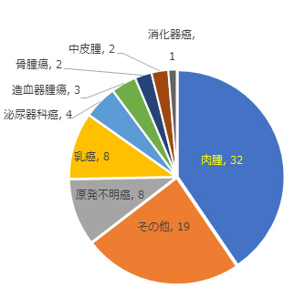 図1のように県央、県北、鹿行地域の広範囲からの入院を受け入れています。原発不明がんの原発巣検索を目的とした短期集中検査が、外来での頻回かつ遠距離通院では困難な場合や、栄養不良状態でご紹介をうけた超高齢者、コントロール不良の糖尿病など合併症の管理が抗がん剤治療開始前に必要な方、また放射線治療のため長期間毎日の通院治療が必要で通院が困難な方、肉腫の治療で48時間の持続抗がん薬投与が必須な方、さらに免疫チェックポイント阻害剤による免疫関連有害事象の治療で入院が必要な方などの診療を入院で行いました。加えて、血液内科に入院中の方の夜間休日のオンコール対応も行っています。原発不明がん、肉腫のご紹介が増加傾向にあり、県中北部における希少難治がんの診断、治療に大きく貢献しています。